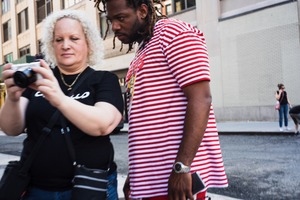 In a bustling street scene, two individuals study a camera, their faces illuminated by soft, midday light. The woman, with vibrant curly hair, leans in, captivated, while the man in a striking red-striped shirt exhibits curiosity. Their connection is palpable against the urban backdrop, capturing a moment of shared discovery amidst city life.