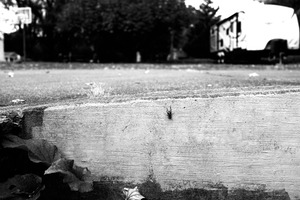 A solitary insect crawls along a cement curb, portrayed with stark clarity against a blurred background of foliage and a parked vehicle. The monochrome palette enhances the mood of quiet contemplation, inviting the viewer to focus on the delicate detail of the small creature. The composition draws the eye downward, emphasizing the contrast between the insect's fragility and the mundane environment surrounding it.