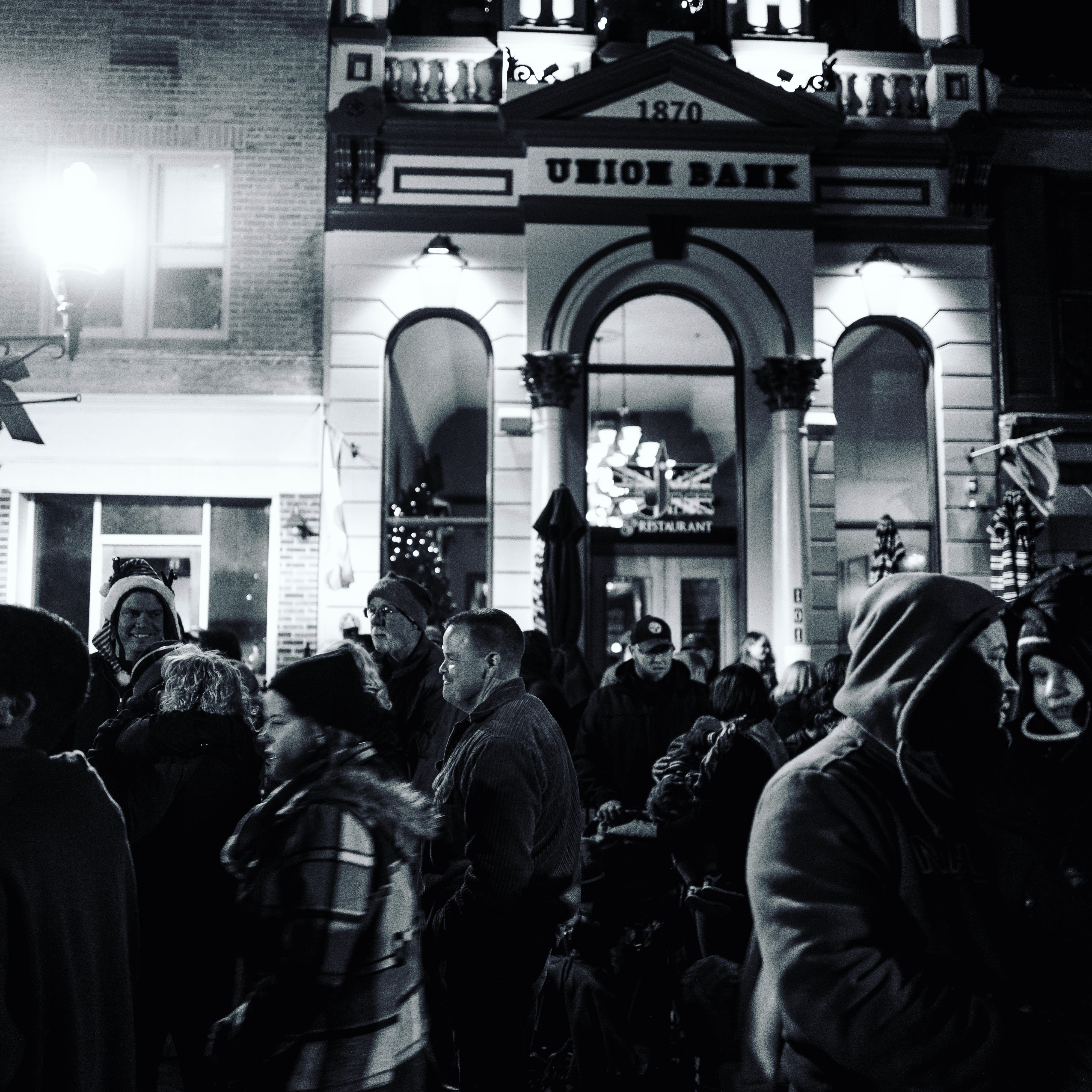 In this monochrome photograph, a bustling crowd gathers outside the historic Union Bank, exuding a sense of community and warmth despite the nighttime chill. The soft glow from street lamps illuminates faces, creating a contrast against the darkened brick facade and lending an intimate, nostalgic mood. The composition captures a dynamic interplay of figures, suggesting both movement and connection in a vibrant urban setting.