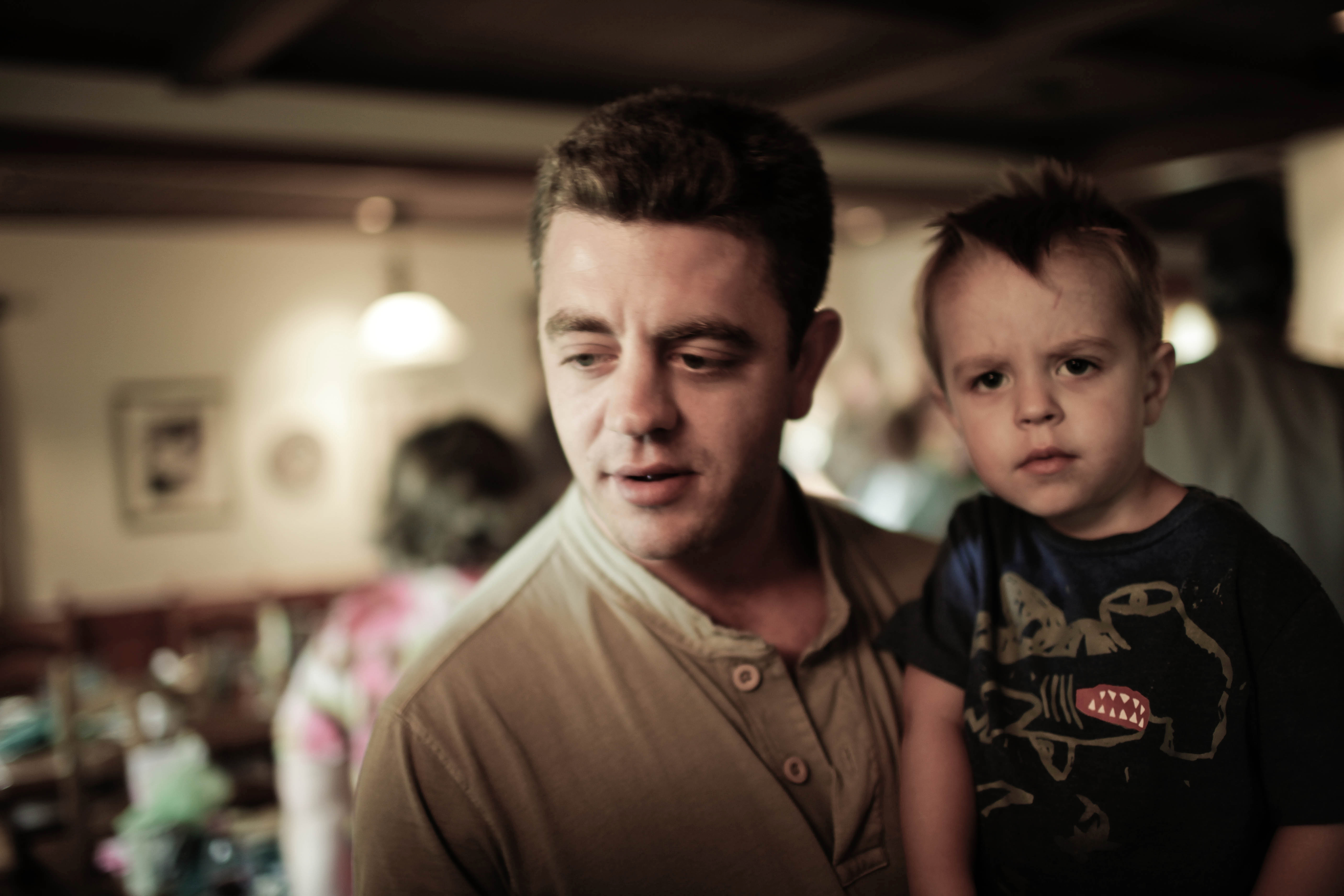In a softly lit setting, a man gazes thoughtfully while holding a child who appears contemplative and slightly bewildered. The warm ambiance is enhanced by the blurred background, capturing a moment of intimacy and connection between them, evoking a sense of tenderness and reflection.