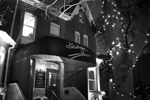 The photograph features a quaint bodega, elegantly set against a darkened sky. Soft lighting from the entrance and twinkling lights on a nearby tree create a warm, inviting atmosphere, contrasting with the stark blacks and whites of the scene. The composition emphasizes the bodega's charming architecture and the cozy allure of an evening out.