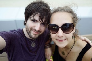 Two friends lean closely together, their faces illuminated by soft, natural light that enhances their warm smiles. The casual composition, framed by a sandy backdrop, creates an inviting and carefree mood, capturing a moment of joy and connection. Both wear relaxed styles, contributing to a laid-back summer vibe.