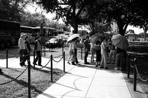 A diverse group of people walks along a path, shaded by large umbrellas against the bright sunlight. The black-and-white composition highlights the textures and contrasts, while the bus-laden background evokes a sense of busyness. The mood is one of leisurely exploration, tinged with anticipation as the crowd seeks refuge from the sun's heat.