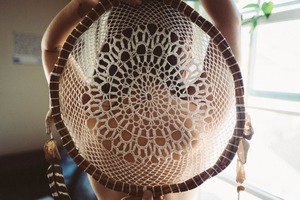 This intimate photograph captures a figure partially obscured by a beautifully intricate dreamcatcher, emphasizing themes of protection and spirituality. Soft, natural light filters through a nearby window, casting gentle shadows and creating an atmosphere of tranquility and warmth. The composition draws the eye to the delicate details of the dreamcatcher, contrasting with the subtle presence of the subject, evoking a sense of mystery and connection to the ethereal.