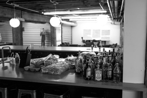 The photograph captures a cozy bar scene, cluttered with an array of liquor bottles that hint at a festive gathering. Soft, ambient lighting from stylish fixtures creates a warm atmosphere, while the black and white tones add a nostalgic quality. The composition draws the eye towards the bar's surface, inviting a sense of relaxation and camaraderie among its unseen patrons.
