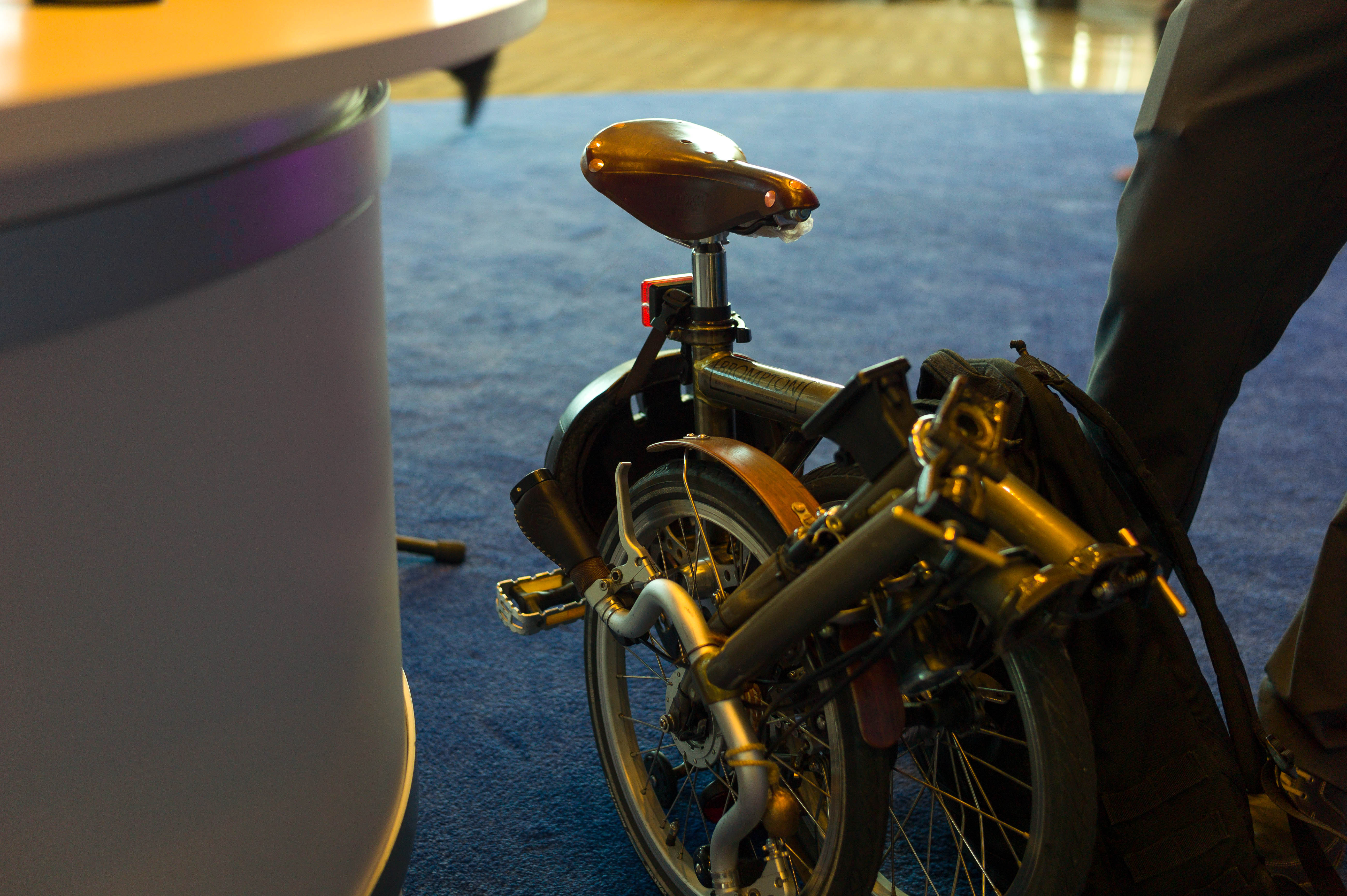 The photograph captures a compact, folded bicycle positioned next to a sleek, modern display stand. Warm lighting accentuates the metallic features of the bike, creating a sense of innovation and urban lifestyle. The blue carpet adds a contrasting touch, grounding the scene in a contemporary setting, suggesting a blend of functionality and style.