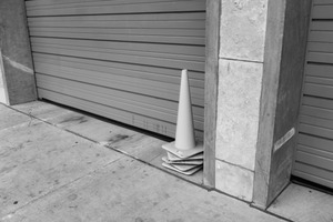 This monochromatic photograph features a solitary traffic cone standing upright beside a stack of discarded cones, leaning against a textured wall. The scene conveys a sense of abandonment and stillness, illuminated by natural light casting soft shadows on the concrete surface. The composition emphasizes the contrast between the structured shapes of the cones and the surrounding urban environment, inviting contemplation of forgotten spaces.