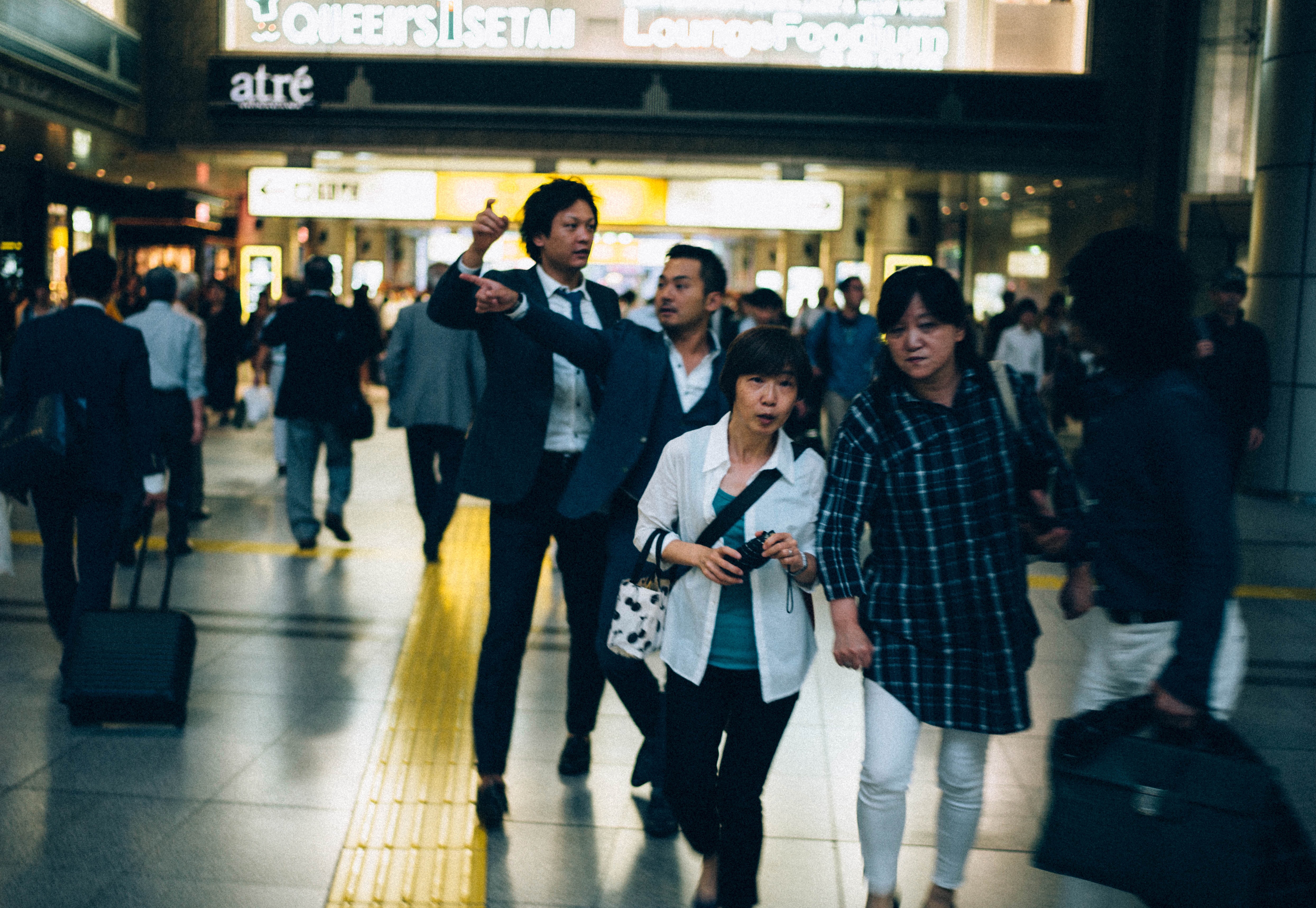 In a bustling train station, a group of people weaves through the crowd, embodying the chaos and energy of city life. The contrast of business attire against casual wear highlights the diversity of daily commuters, while soft, ambient lighting creates a slightly dreamy atmosphere. The man gesturing in the foreground draws attention, suggesting a moment of connection amidst the hurried pace.