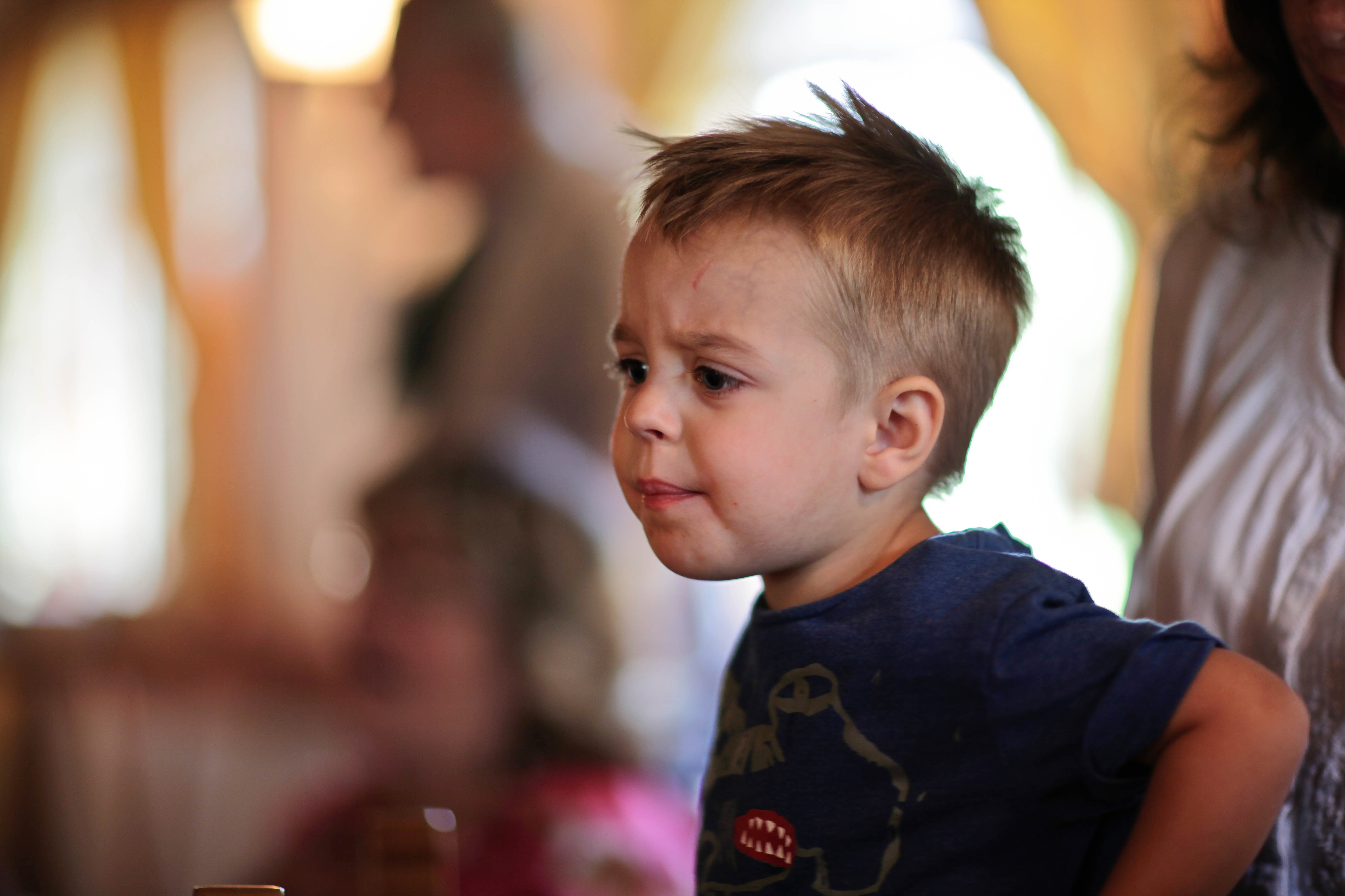 A young boy's expressive face captures a moment of contemplation, with his lips pursed in thought. The soft, diffused lighting and warm tones create a cozy, intimate atmosphere, while the blurred background hints at a lively gathering. His focused gaze draws the viewer in, perfectly encapsulating the wonder of childhood.
