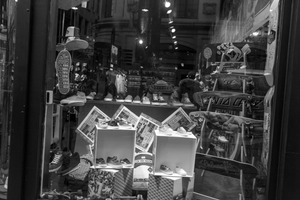 This monochromatic photograph captures a bustling skate shop window, filled with an array of sneakers and skateboard gear. The composition highlights the stark contrast between the vibrant products and the muted tones of the surroundings, creating a lively yet nostalgic atmosphere. Soft overhead lighting enhances the textures and details, inviting passersby to explore the urban skate culture within.