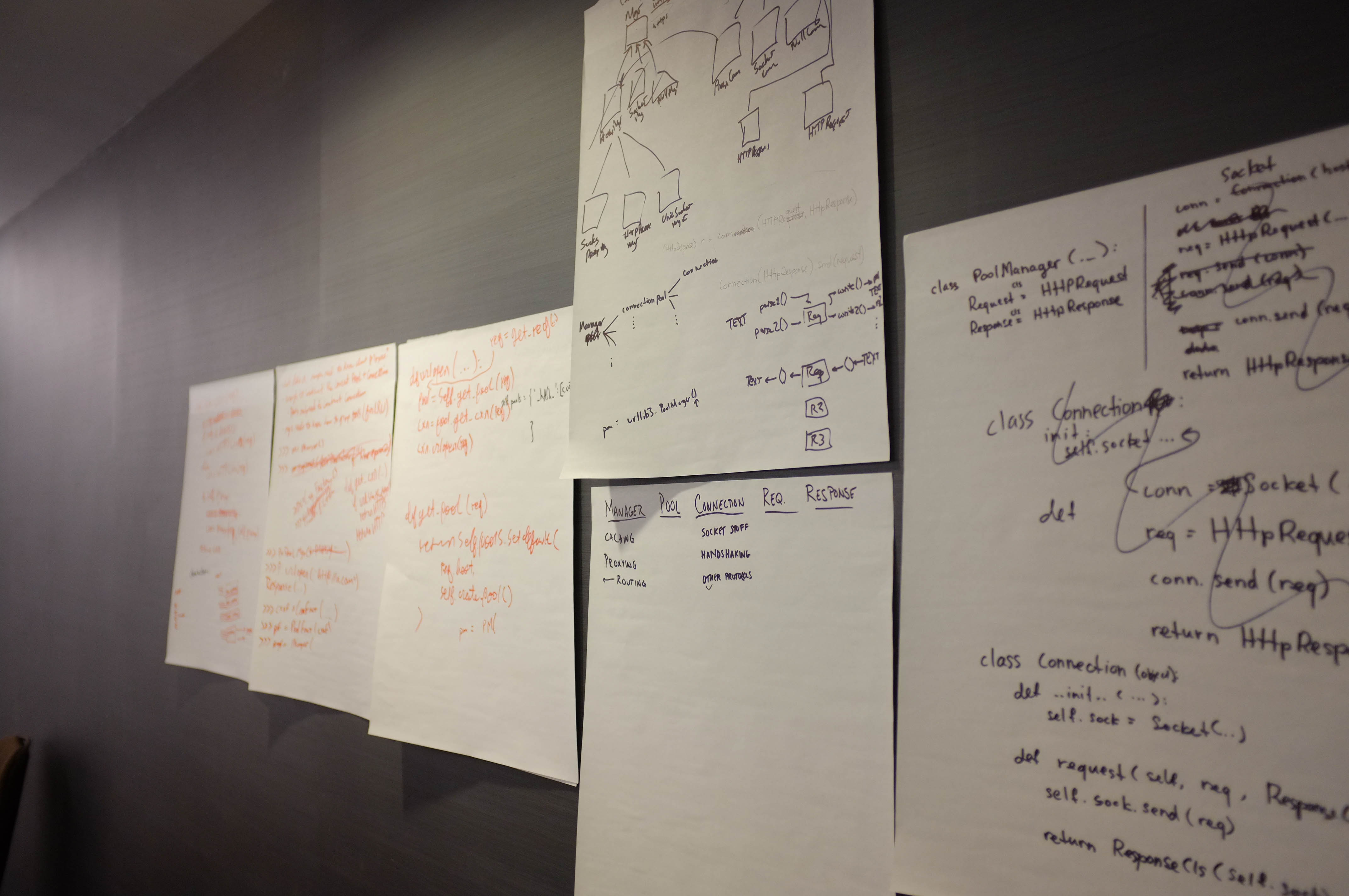 The photograph captures a textured wall adorned with various sheets of paper filled with handwritten notes, diagrams, and code snippets. The mood is dynamic and intellectual, conveying a sense of collaboration and problem-solving. Soft lighting enhances the clarity of the notes, inviting the viewer into a space of creativity and innovation.
