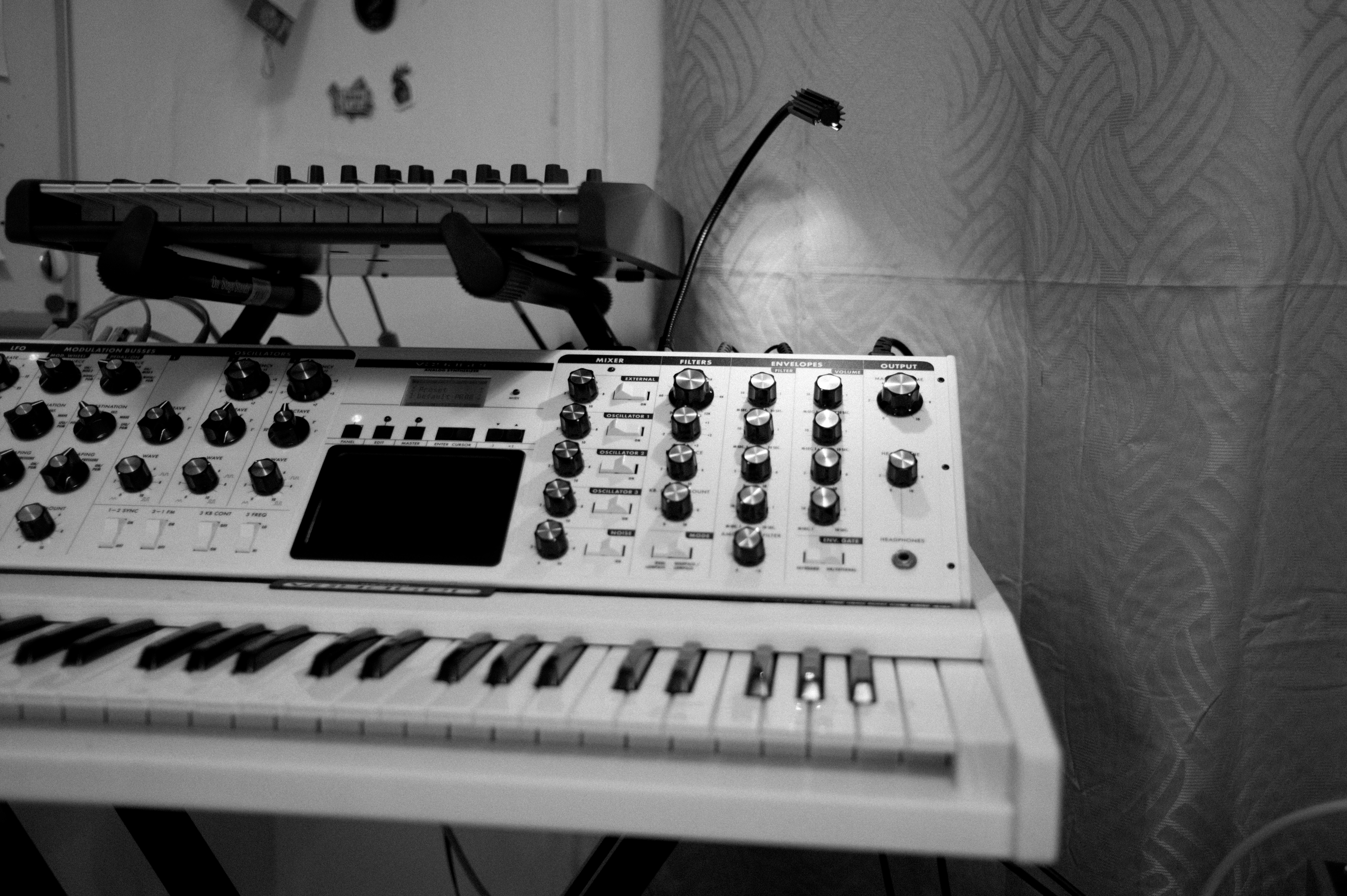 The photograph captures a close-up view of a beautifully arranged synthesizer setup, showcasing a blend of knobs and keys. The monochrome palette enhances the intimate and nostalgic mood, while soft lighting from the background creates subtle shadows, emphasizing the intricate details of the instruments. The composition draws the viewer's eye towards the complex controls, inviting thoughts of creativity and sound exploration.