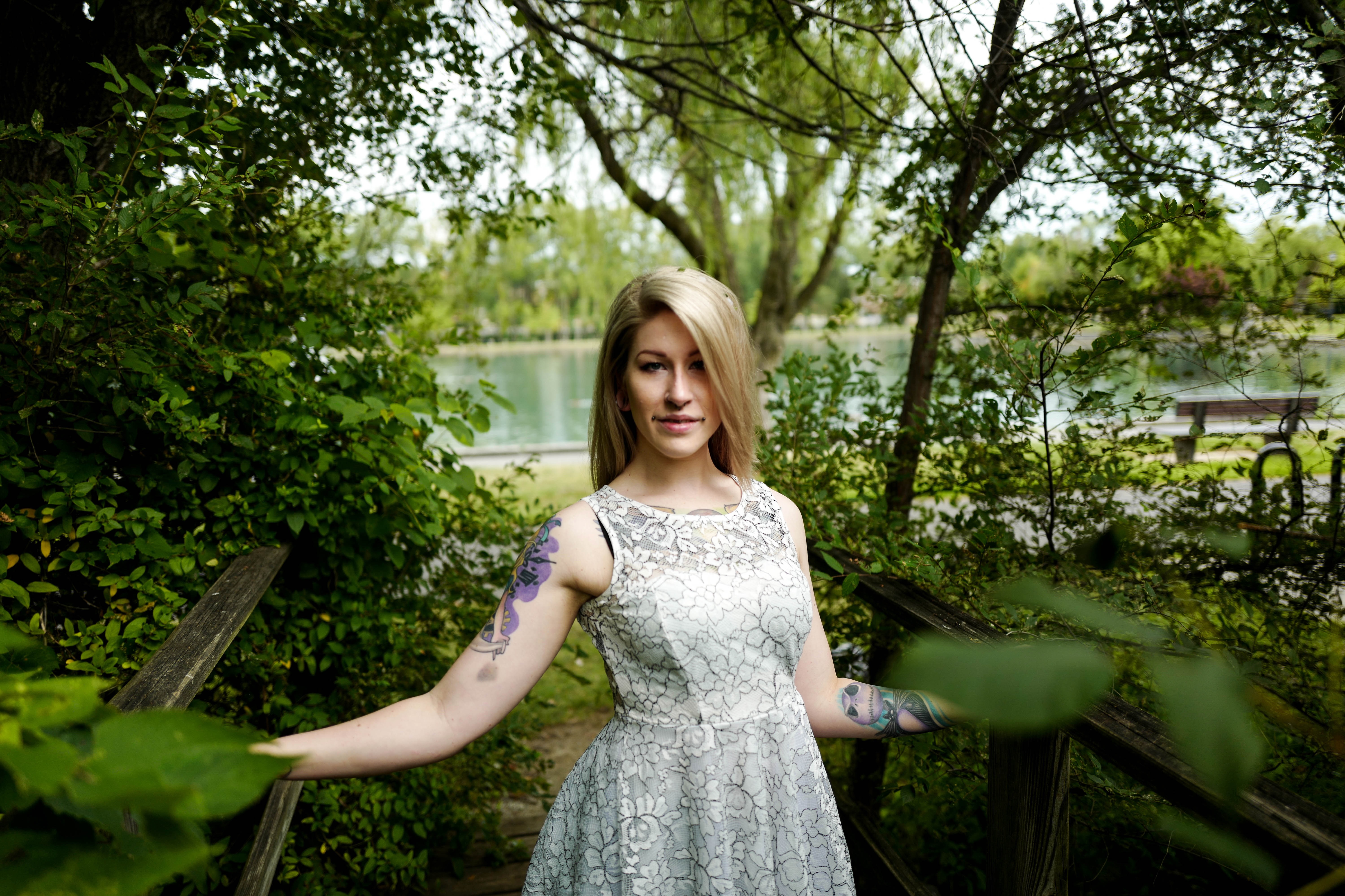 The photograph captures a woman in a delicate, intricately patterned dress standing among lush greenery, exuding a serene confidence. Soft, natural light filters through the leaves, highlighting her features and the colorful tattoos that contrast with her outfit, creating a harmonious blend of nature and personality. The gentle background blur of the lake adds a tranquil mood, inviting the viewer into this enchanting moment.