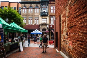 This photograph captures a lively market alley framed by charming historical buildings, where vendors display their colorful goods beneath vibrant green tents. The warm, inviting light casts soft shadows, enhancing the relaxed atmosphere as people stroll leisurely, engaging in conversation and enjoying the sights. An interesting juxtaposition of the rustic brick wall on the right adds texture and depth to the scene, inviting viewers into this urban enclave.