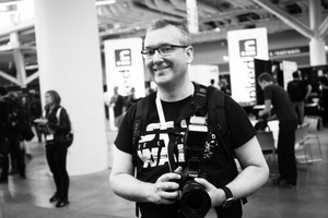 In the vibrant atmosphere of an event, a smiling photographer stands confidently, holding a Canon camera. The monochromatic tones emphasize his upbeat demeanor, contrasting with the bustling crowd in the background, enhancing the sense of connectivity and enthusiasm for the art of photography.