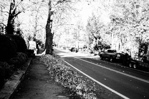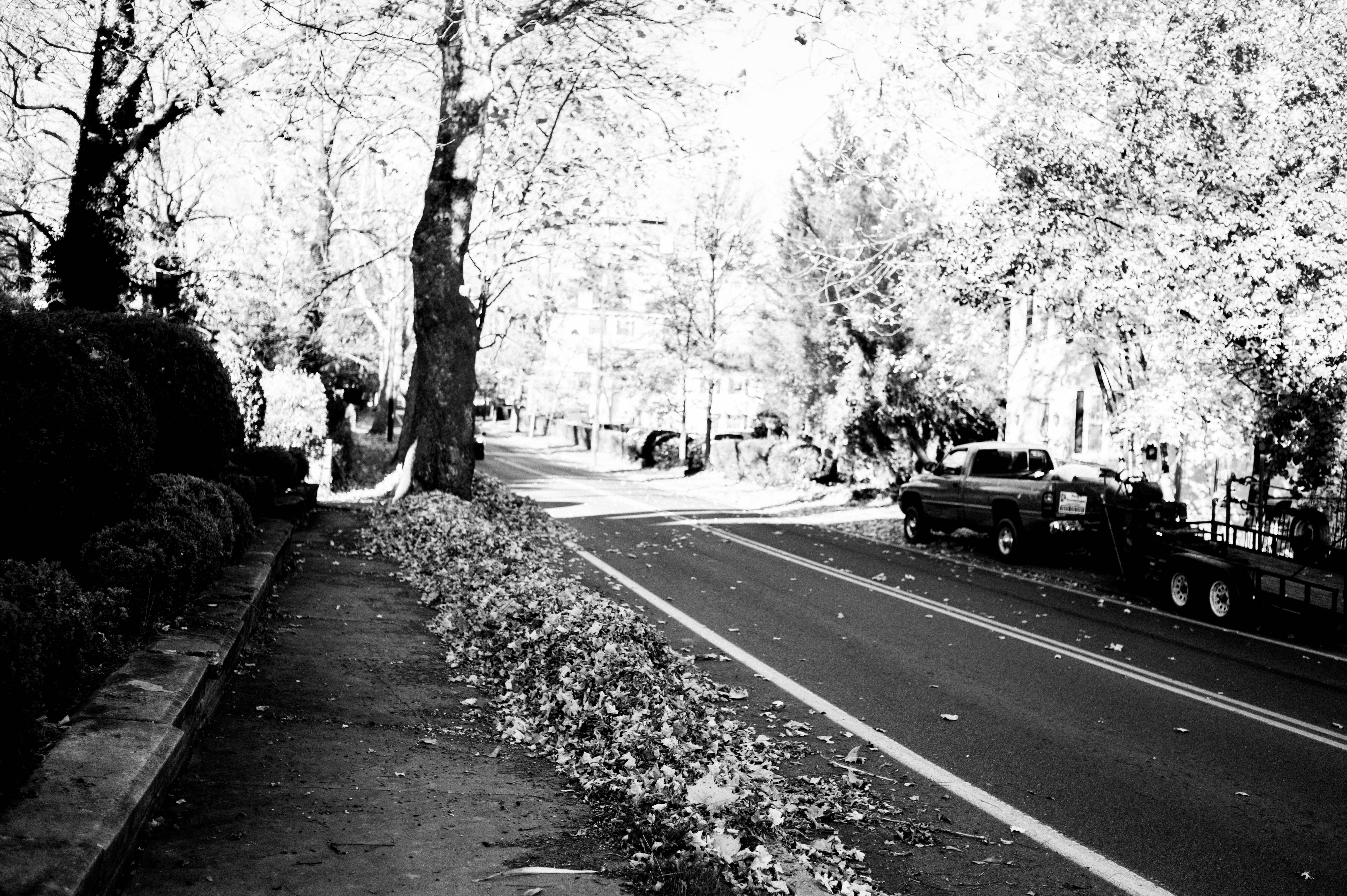 In this black-and-white photograph, a tranquil street lined with trees and fallen leaves invites a sense of solitude. The composition features a stark contrast between the dark foliage and the lighter pavement, creating a peaceful yet haunting mood. Soft sunlight filters through the branches, casting gentle shadows that enhance the feeling of stillness in the air.