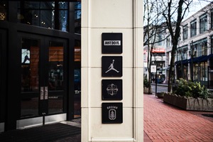 This photograph captures a modern, urban scene featuring a series of iconic logos on a building pillar. The stark contrast between the black signage and the lighter building gives a bold and confident mood, while the soft, natural light filtering through suggests a calm, early morning atmosphere. The composition draws the eye vertically, leading from the motivational slogan to the recognizable symbols of sports and local heritage.