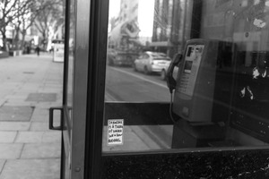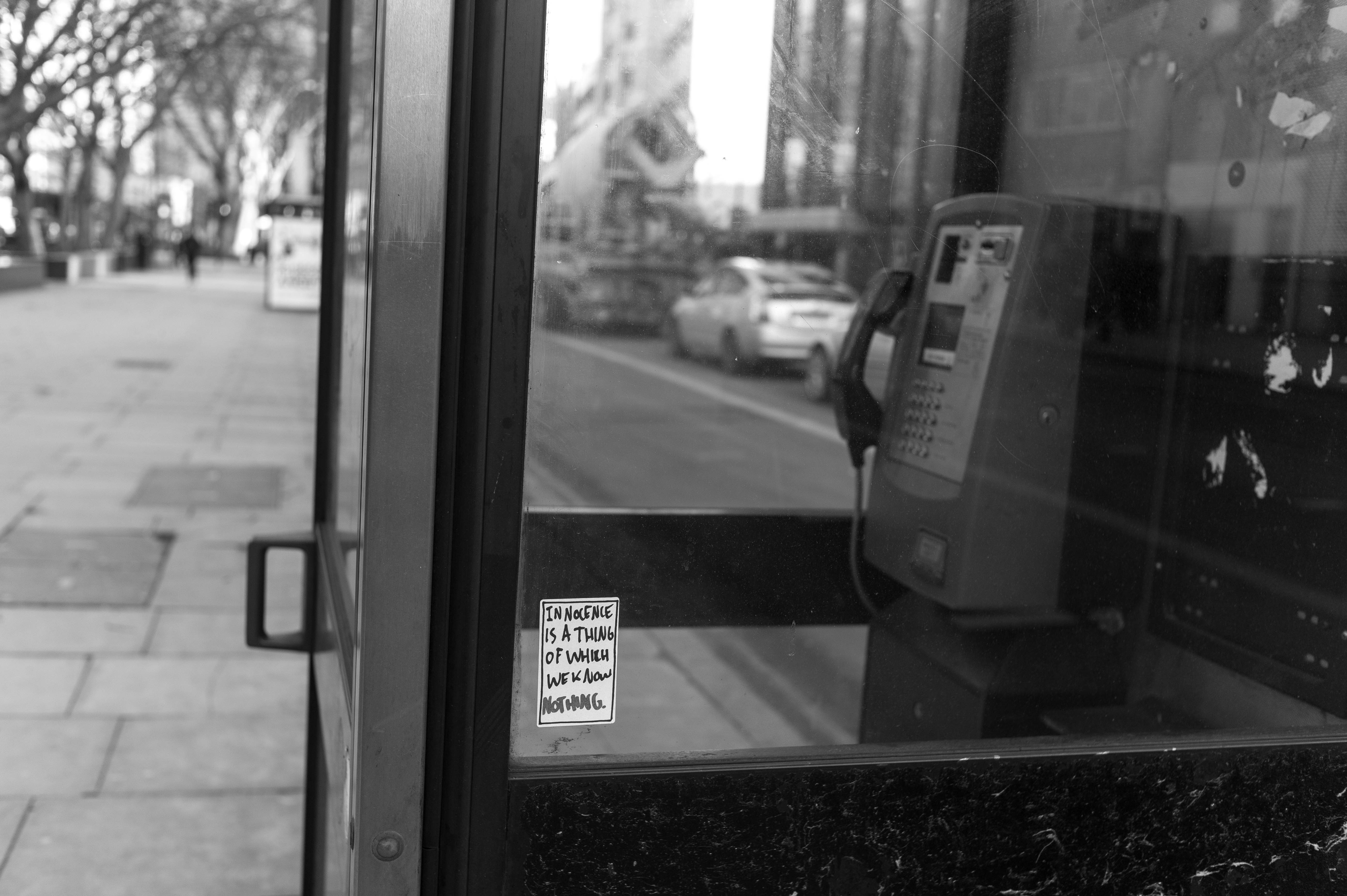 The photograph captures a solitary phone booth, its glass reflecting the urban landscape while a small sticker on the window bears a thought-provoking message about innocence. The black and white tones create a somber mood, emphasizing the quiet emptiness of the scene. Soft, diffused light filters through the glass, casting gentle shadows and enhancing the sense of isolation.