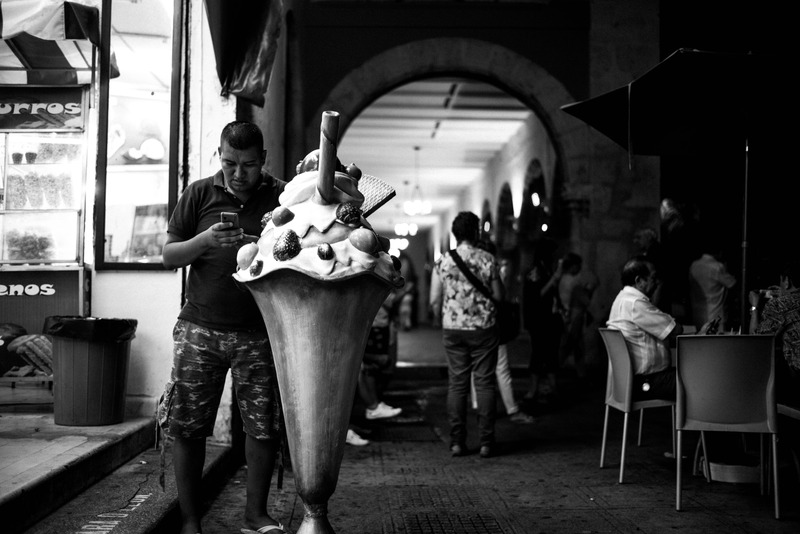 In this striking black-and-white photograph, a man stands absorbed in his phone, framed by the towering ice cream cone sculpture that serves as a whimsical backdrop. The dim lighting casts a contemplative mood over the bustling scene, where the blurred figures of pedestrians hint at a vibrant life bustling beyond the foreground. The juxtaposition of the sweet treat and the man's distant demeanor evokes a sense of bittersweet nostalgia in an urban setting.