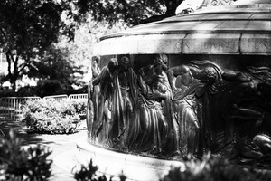 The photograph captures a detailed view of a somber sculpture, depicting figures entwined in an expression of sorrow and reflection. The interplay of light and shadow creates a dramatic mood, emphasizing the intricate textures of the stone and the emotions etched into each figure. Surrounded by soft foliage and barriers, the scene evokes a sense of quiet reverence amidst the chaos of the outside world.