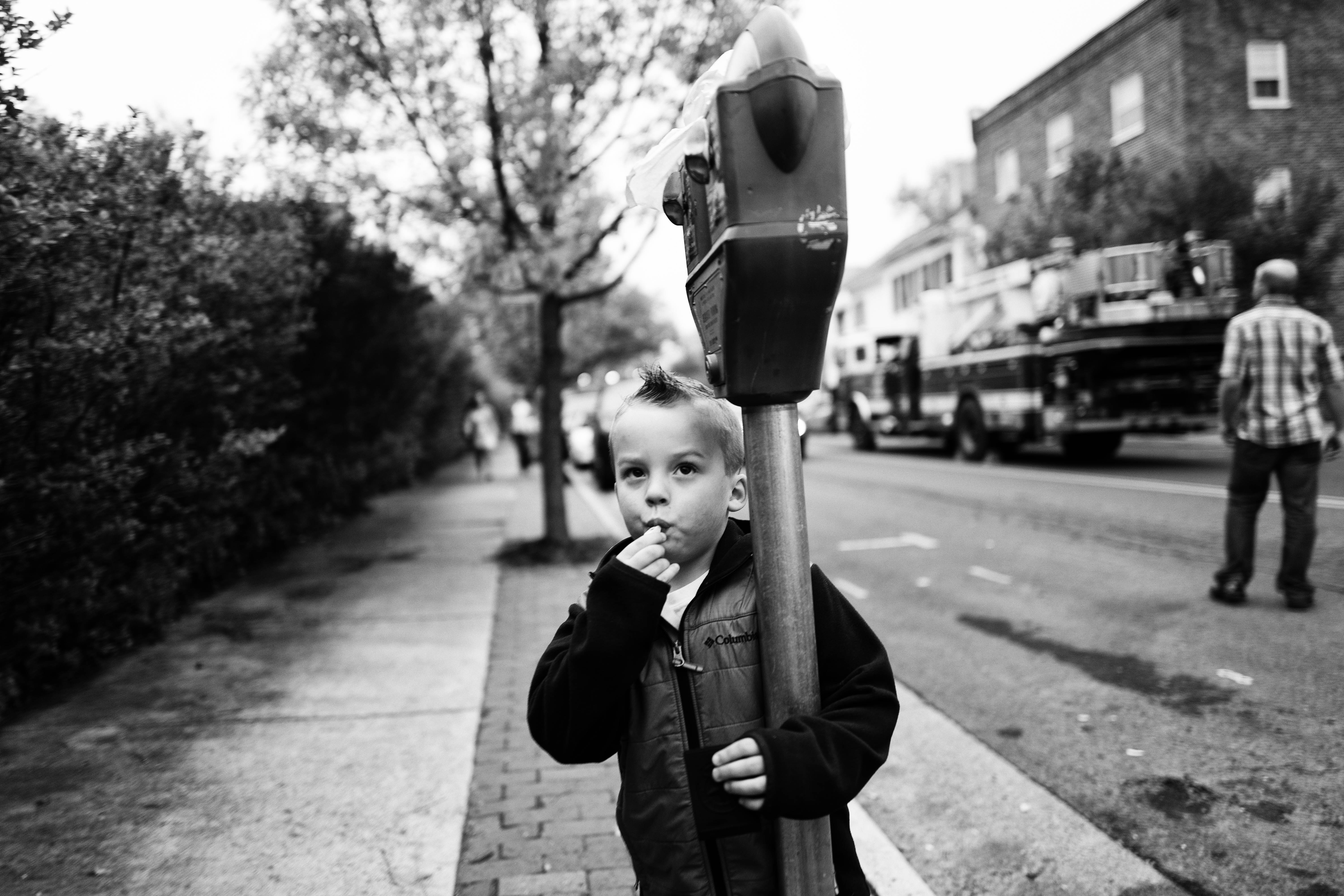 In a striking black-and-white composition, a young boy stands beside a parking meter, his expression a mix of curiosity and contemplation. The surrounding urban scene is blurred, emphasizing his solitude amidst a bustling street, while soft, diffused lighting adds a sense of introspection. The contrast of his innocent demeanor against the adult world around him creates an evocative narrative of childhood and urban life.
