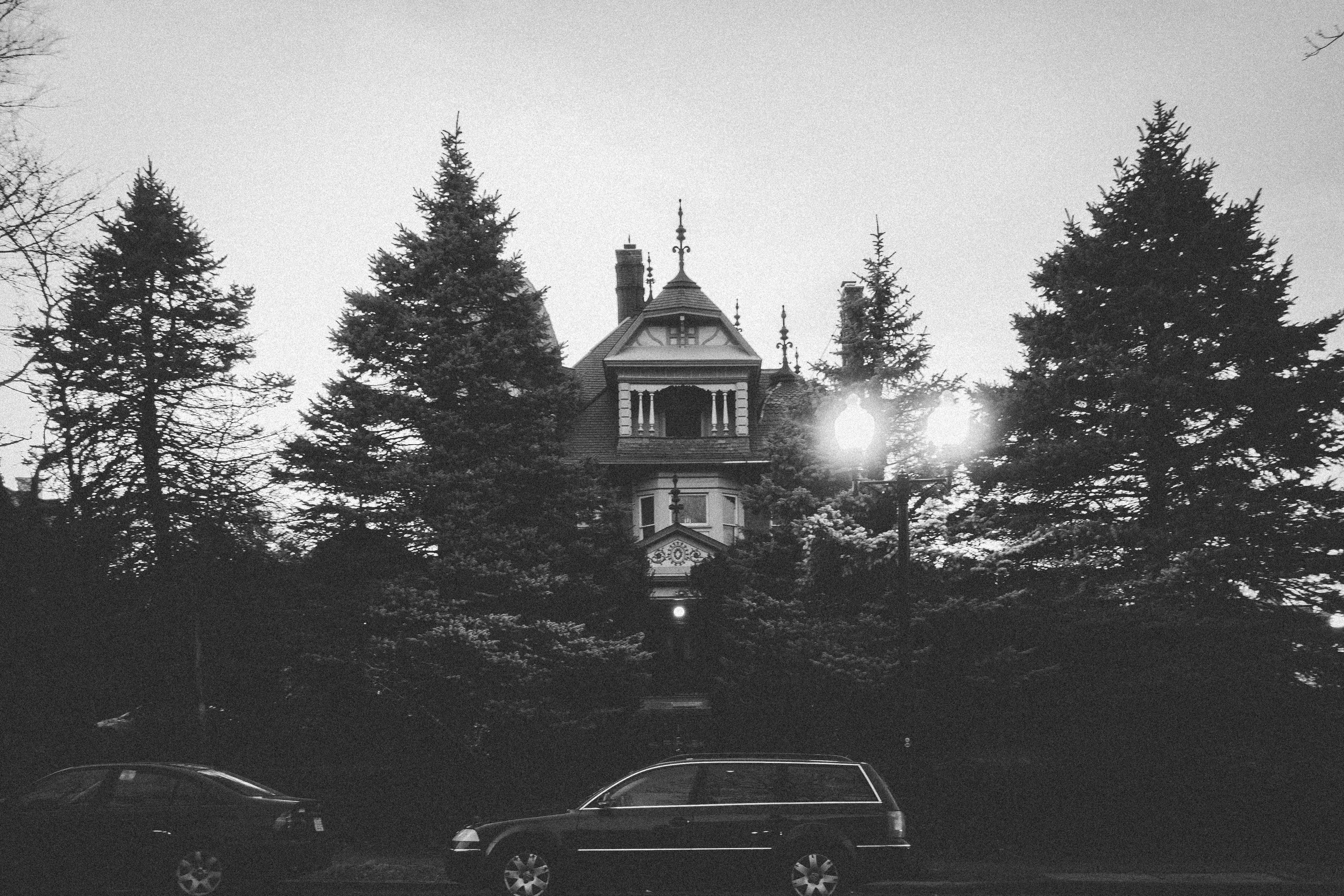 This striking black and white photograph captures an ornate mansion framed by towering evergreen trees, which cast shadows around the structure. The dim light from the streetlamps lends an eerie ambiance, enhancing the house’s vintage charm and evoking a sense of mystery. The composition draws the viewer's eye upwards, emphasizing the intricate architectural details against the twilight sky.