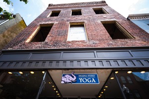This photograph captures the weathered charm of an old brick building with large, empty windows, taking on a sense of history and tranquility. The bright blue sign for 'Dharma Studio Yoga' with an elephant motif stands out against the rustic facade, suggesting a peaceful escape amid the urban hustle. Soft natural lighting streams down, enhancing the inviting mood of this serene space.