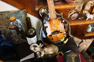 This photograph captures a richly cluttered table brimming with cherished trinkets, each telling a story of its own. The warm lighting highlights a vintage mandolin adorned with stickers, exuding a sense of nostalgia and creativity, while a quietly observing painting of a boy adds a whimsical touch to the scene. The mood is inviting and slightly playful, evoking memories of cherished moments and artistic expression.