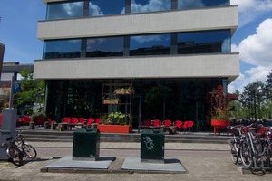 The photograph captures a modern building with a sleek facade and large windows reflecting a vivid sky. Bright red chairs contrast with the building’s neutral tones, creating an inviting atmosphere, while the strategically placed greenery adds a touch of life. The composition is balanced, emphasizing the interplay of architectural geometry and urban vibrancy under a bright, sunny day.