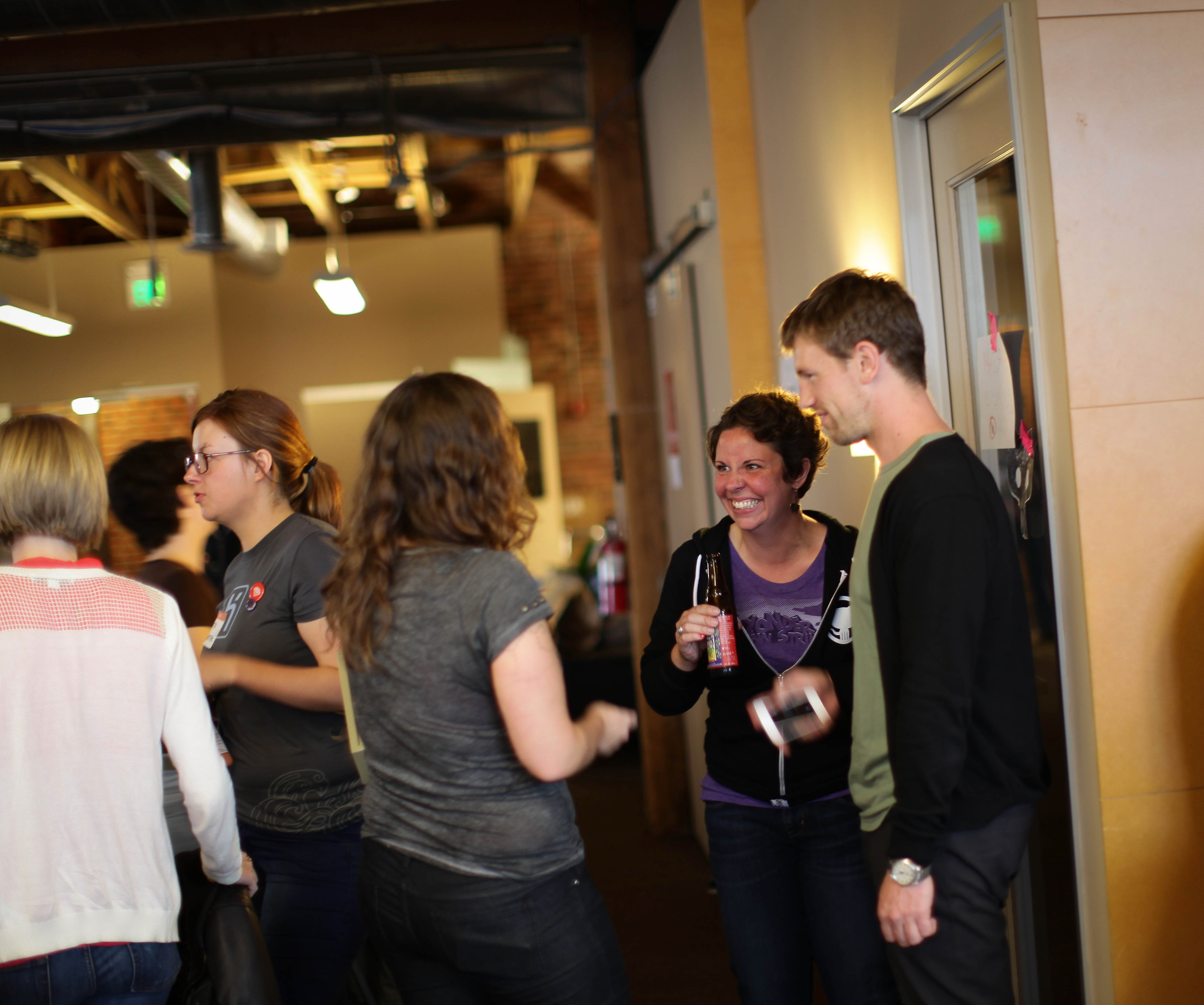 The photograph captures a lively gathering of friends or colleagues engaged in animated conversations, surrounded by a warm, rustic environment. Soft, diffused lighting highlights their smiles and laughter, creating an inviting and cheerful mood. The composition features various individuals in mid-interaction, emphasizing connectivity and camaraderie within the space.