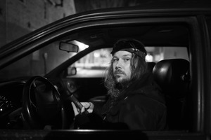 In a dimly lit car, a young man gazes intently at the camera, his expression a blend of contemplation and curiosity. The stark black-and-white contrast enhances the mood, highlighting the textures of his hair and the shadows within the vehicle. Outside, the blurred lights suggest a quiet urban night, adding an air of mystery to the intimate moment.
