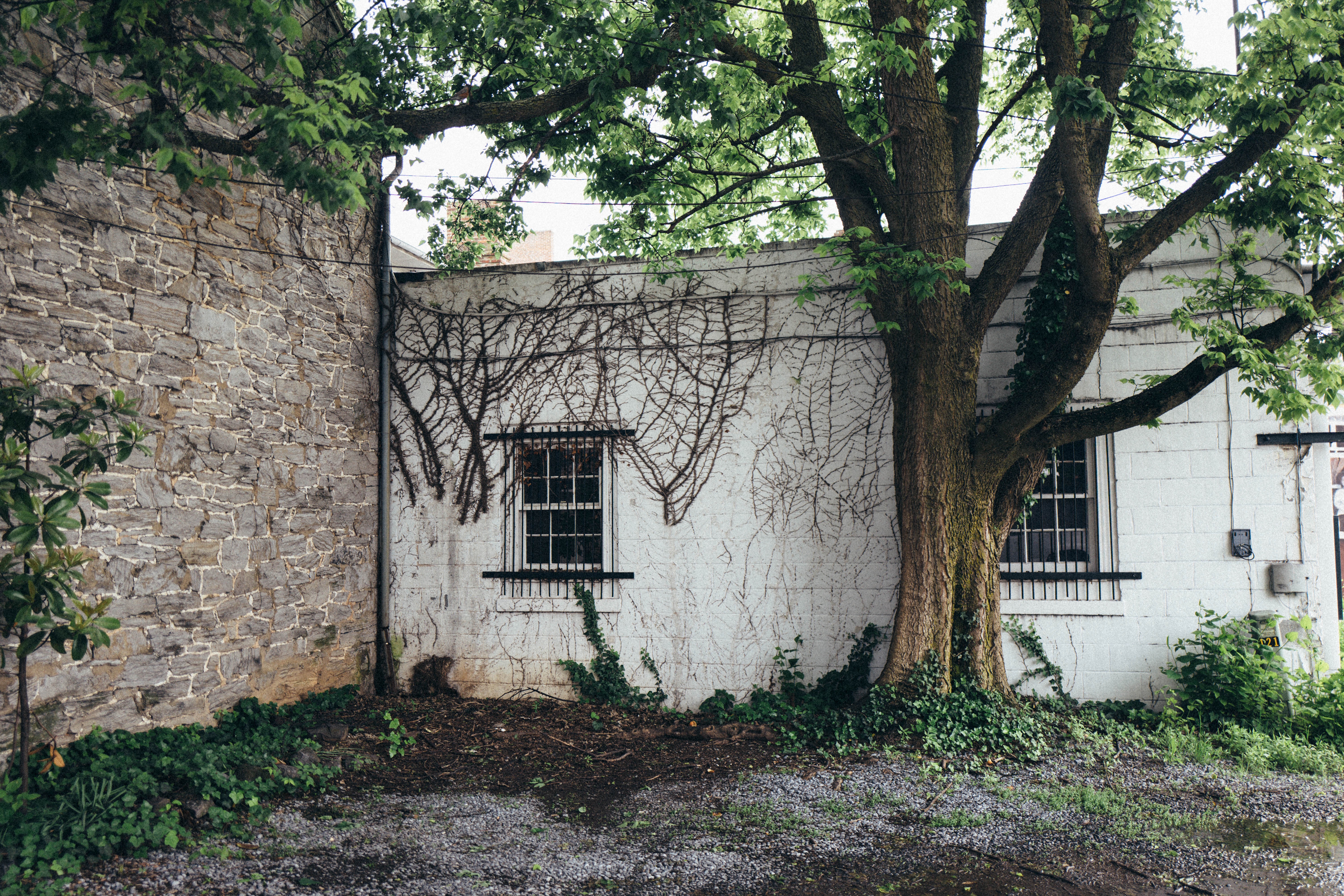 In this serene composition, a weathered white wall is entwined with creeping vines, creating a delicate contrast against the starkness of its surface. The robust tree stands beside the wall, its leaves filtering soft, dappled light, which enhances the tranquil mood of the scene. This juxtaposition of stone, nature, and light evokes a sense of timelessness and quietude.