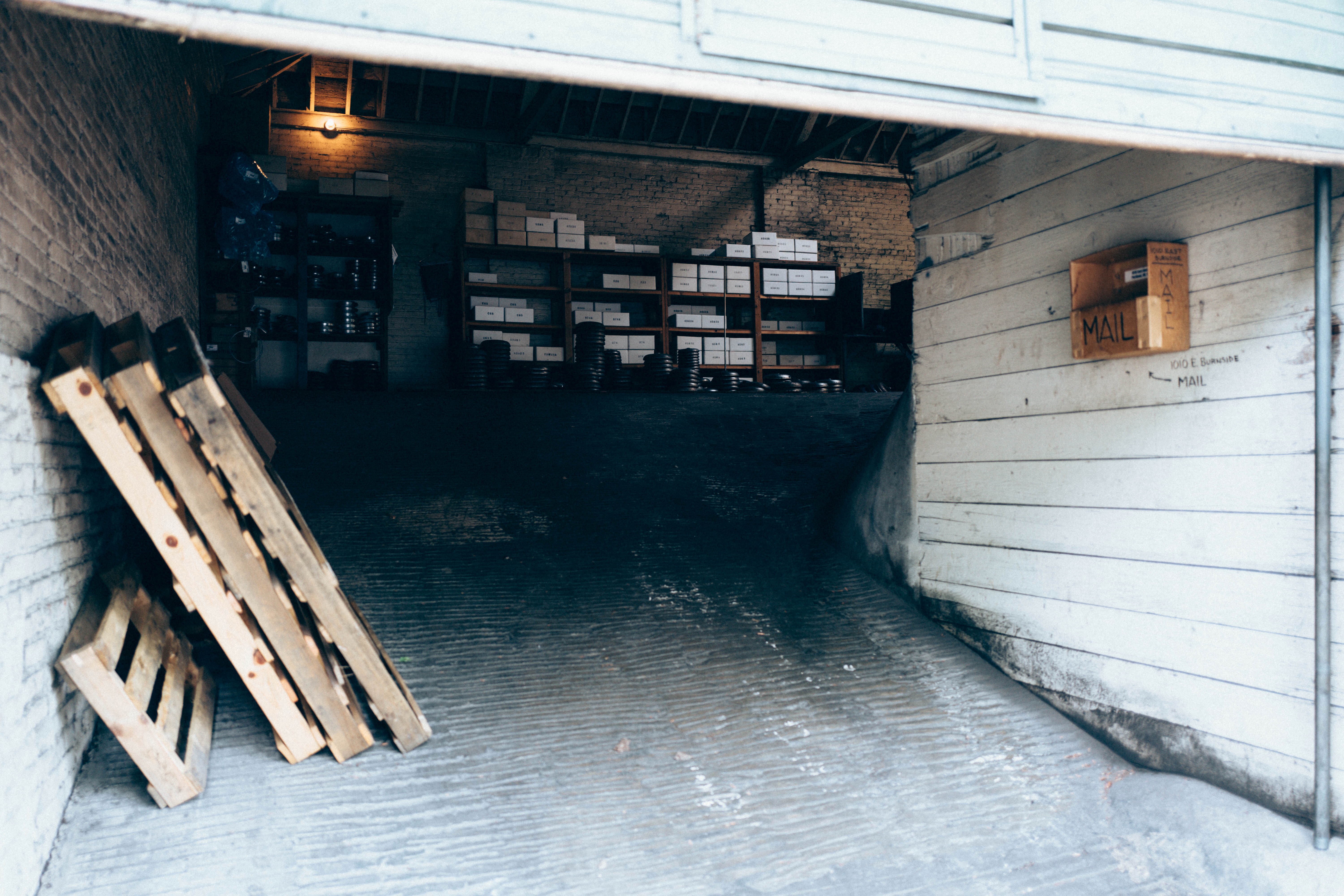 This photograph captures the quiet, industrial atmosphere of an empty warehouse, its dimly-lit interior hinting at past activity. Wooden pallets lean against a wall, while neatly stacked boxes organize the space, their shadows stretching across the ground. The interplay of light and shadow adds a sense of stillness and nostalgia, inviting the viewer to ponder the stories held within these walls.