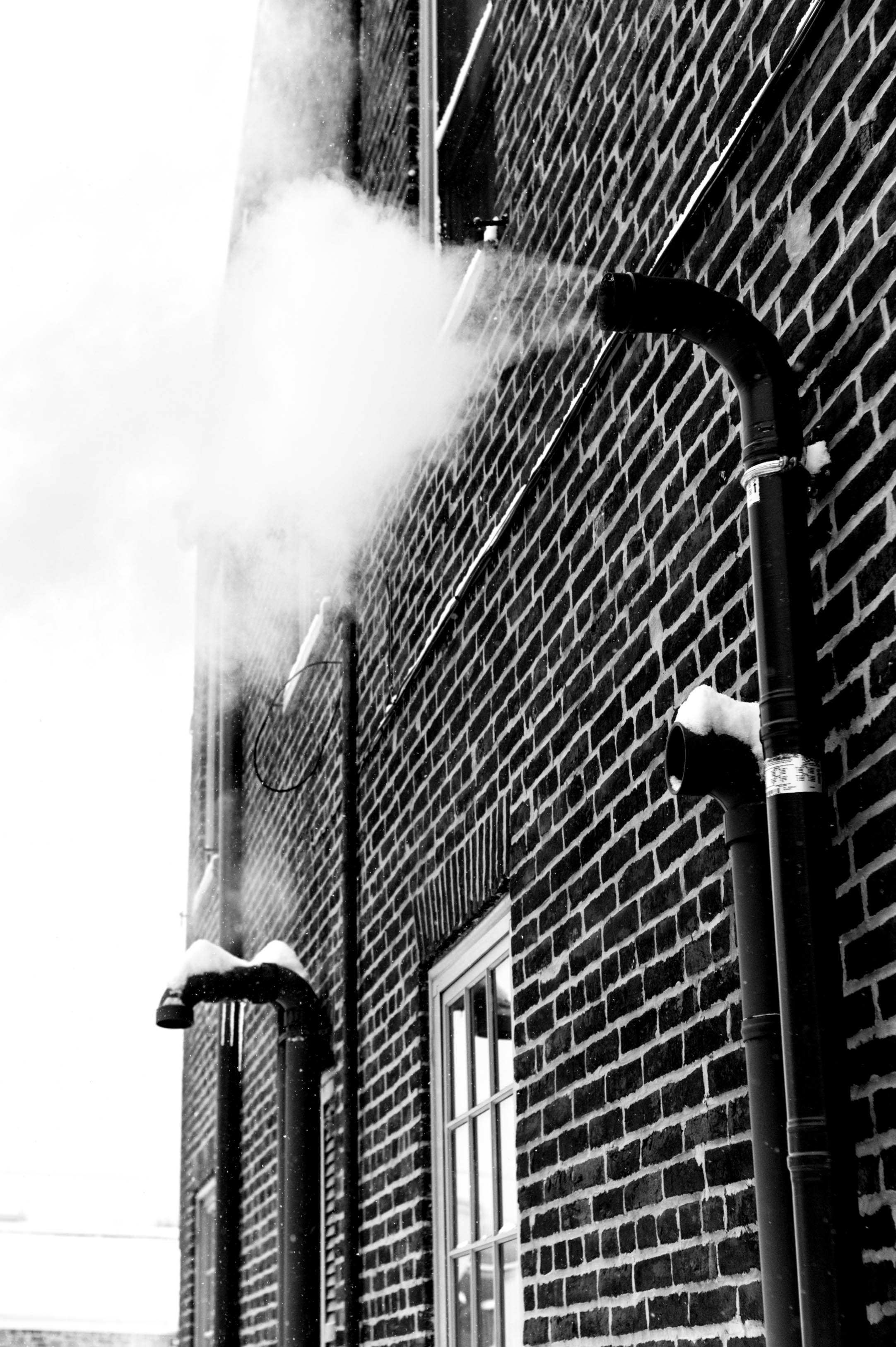 This monochromatic photograph captures the stark contrast between the dark brick wall and the wisps of steam escaping from pipes. The snow atop the pipes adds a touch of winter's chill, while the misty plume suggests warmth within. The composition emphasizes the industrial rhythm of urban life, evoking a sense of solitude and contemplation amidst the cold atmosphere.
