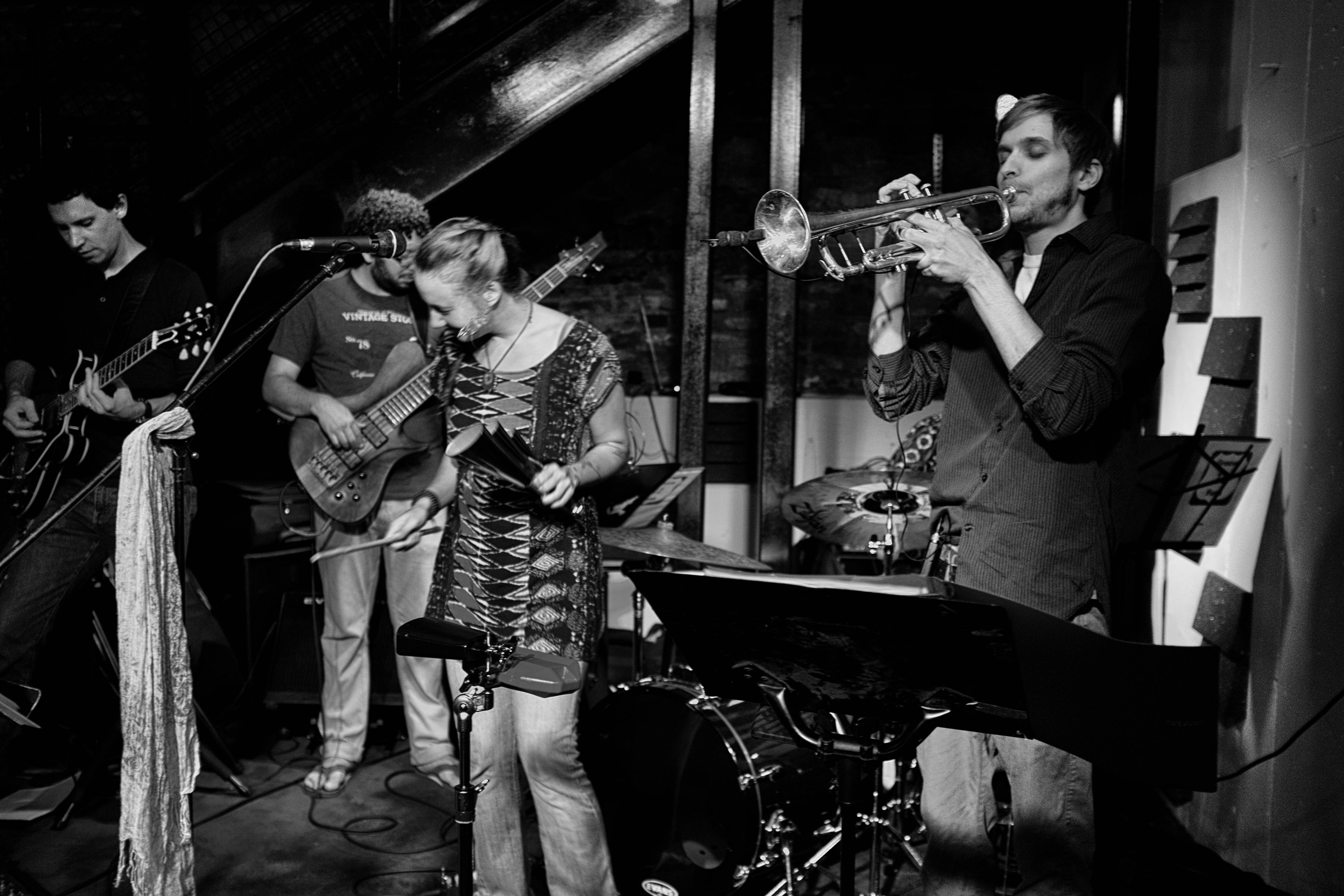 In this intimate black-and-white photograph, a lively band performs, capturing the essence of a passionate musical moment. The interplay of light and shadow enhances the atmosphere, highlighting the concentration of the musicians and the vibrant energy of the scene. Each musician is engaged in their craft, seamlessly blending together in a dynamic composition that invites the viewer into their world.