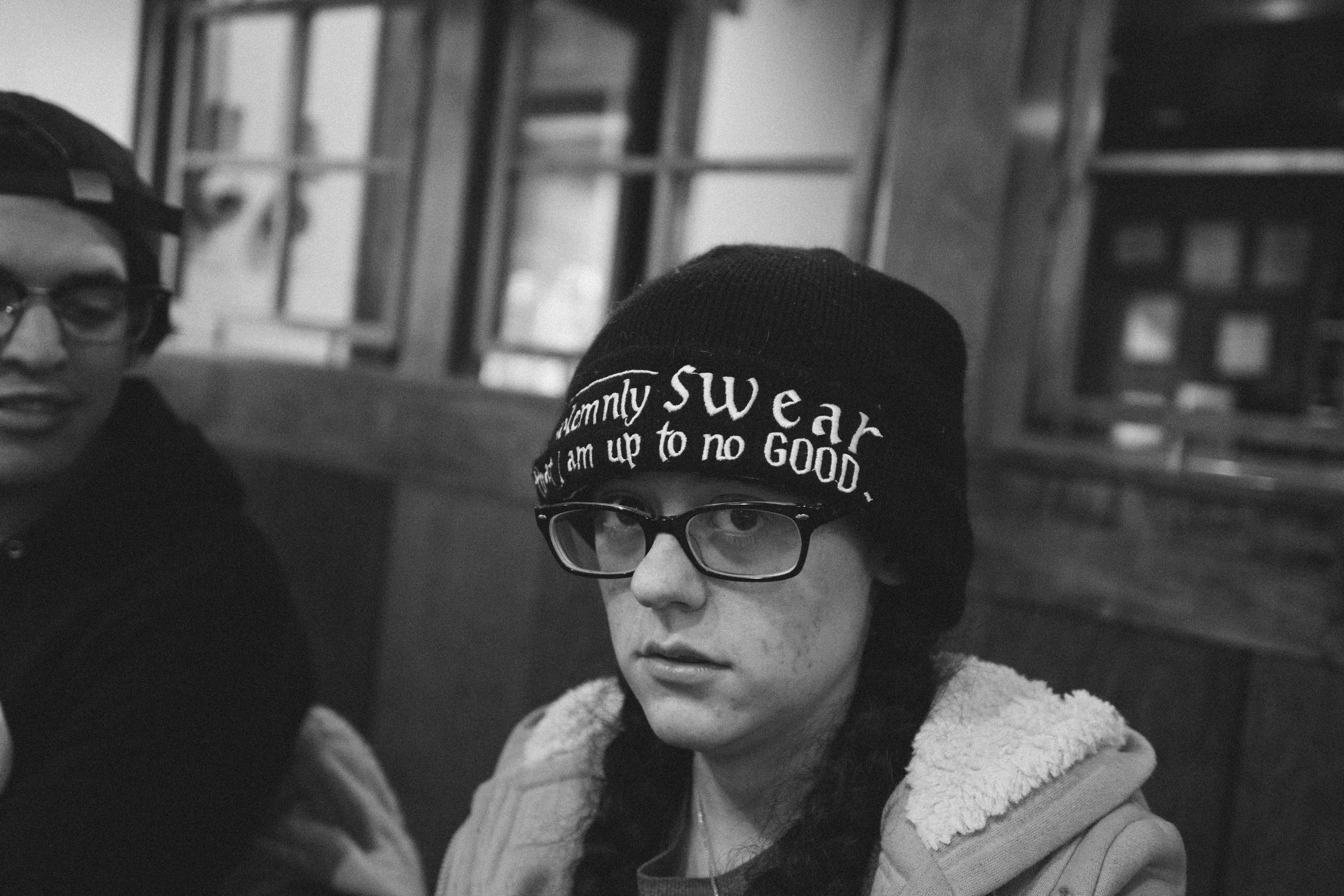 In this intimate black-and-white portrait, a young woman with braided hair dons a beanie that cheekily declares her mischief. Her serious expression contrasts with the playful message on her hat, creating an intriguing tension. Soft, diffused lighting captures her thoughtful demeanor, while the blurred presence of a companion suggests a moment of shared experience in a candid setting.