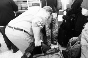 In a busy airport setting, a man leans forward, searching through his bag with focused determination. The monochromatic tones heighten the sense of urgency and chaos surrounding him, while the blurred figures in the background emphasize the hustle of travel. The composition captures a moment of personal struggle amidst the crowded environment, evoking the shared tension of anticipation and adventure.