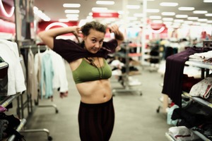 In an inviting retail space, a young woman playfully changes her shirt, exposing a vibrant green crop top under the warm fluorescent lighting. The composition captures her energetic spirit amidst racks of colorful clothing, creating a lighthearted and candid moment. The blurred background emphasizes her as the focal point, enhancing the sense of spontaneity and fun in an everyday shopping experience.