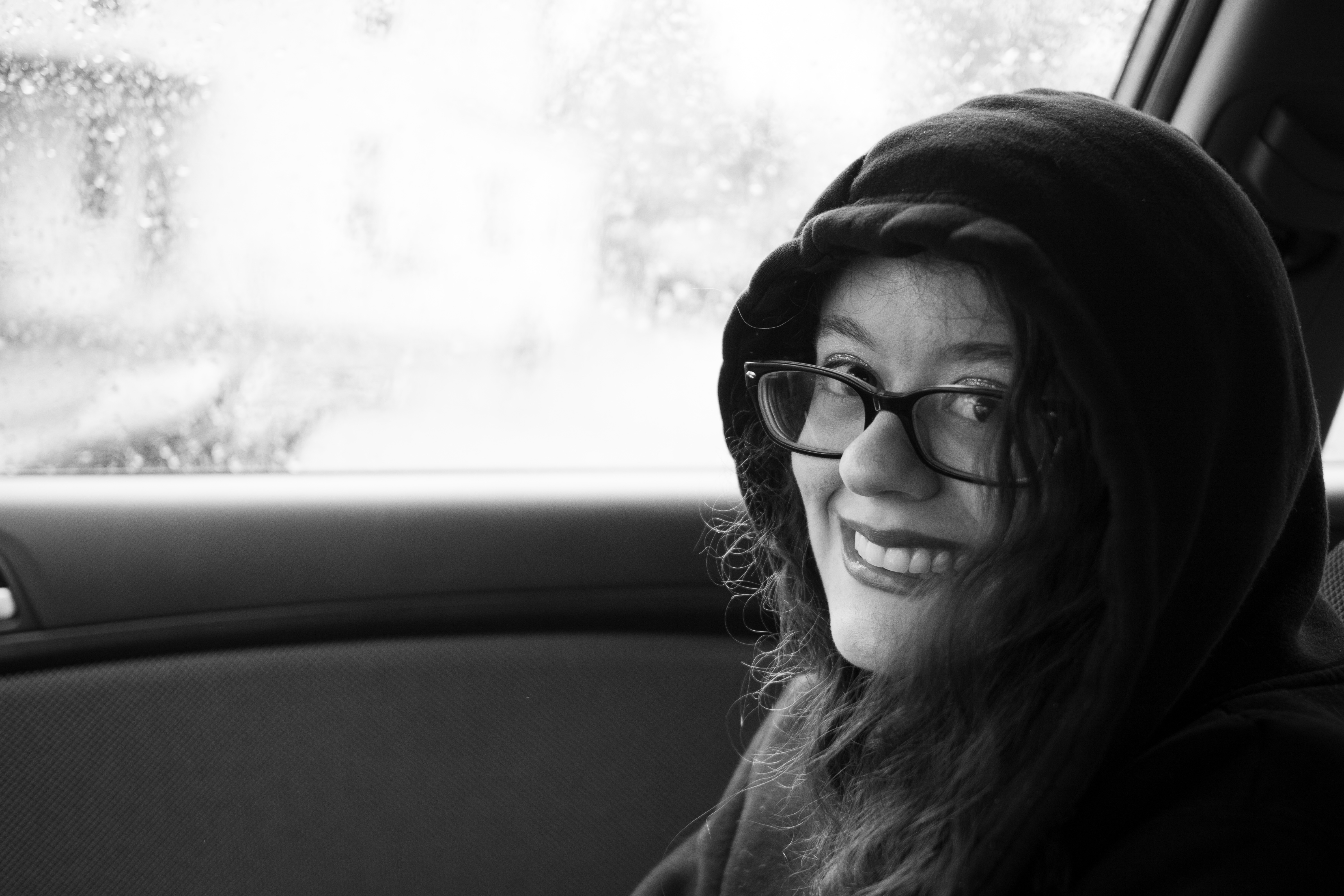 In this intimate black-and-white photograph, a young woman in a hooded sweatshirt smiles gently from the interior of a car, her playful spirit evident despite the rainy backdrop outside. The soft lighting and blurred raindrops on the window create a mood of cozy solitude, contrasting beautifully with her bright demeanor and playful glasses.