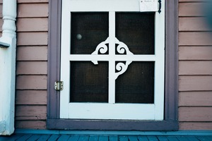 The photograph captures a quaint wooden door adorned with intricate white designs, set against a muted pink backdrop. Soft, diffused light enhances the textures of the wood, creating a serene and nostalgic mood. A small sign hints at stories untold, drawing the viewer into the charm of this forgotten entrance.