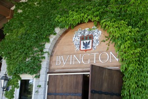 The photograph captures an inviting entrance to Byington, framed by lush green ivy cascading down the stone facade. The warm wooden doors are ajar, suggesting a welcoming atmosphere, while the vibrant greens contrast beautifully with the rustic elements of the structure. Soft, natural light casts a gentle glow, enhancing the tranquil and serene mood of the scene.