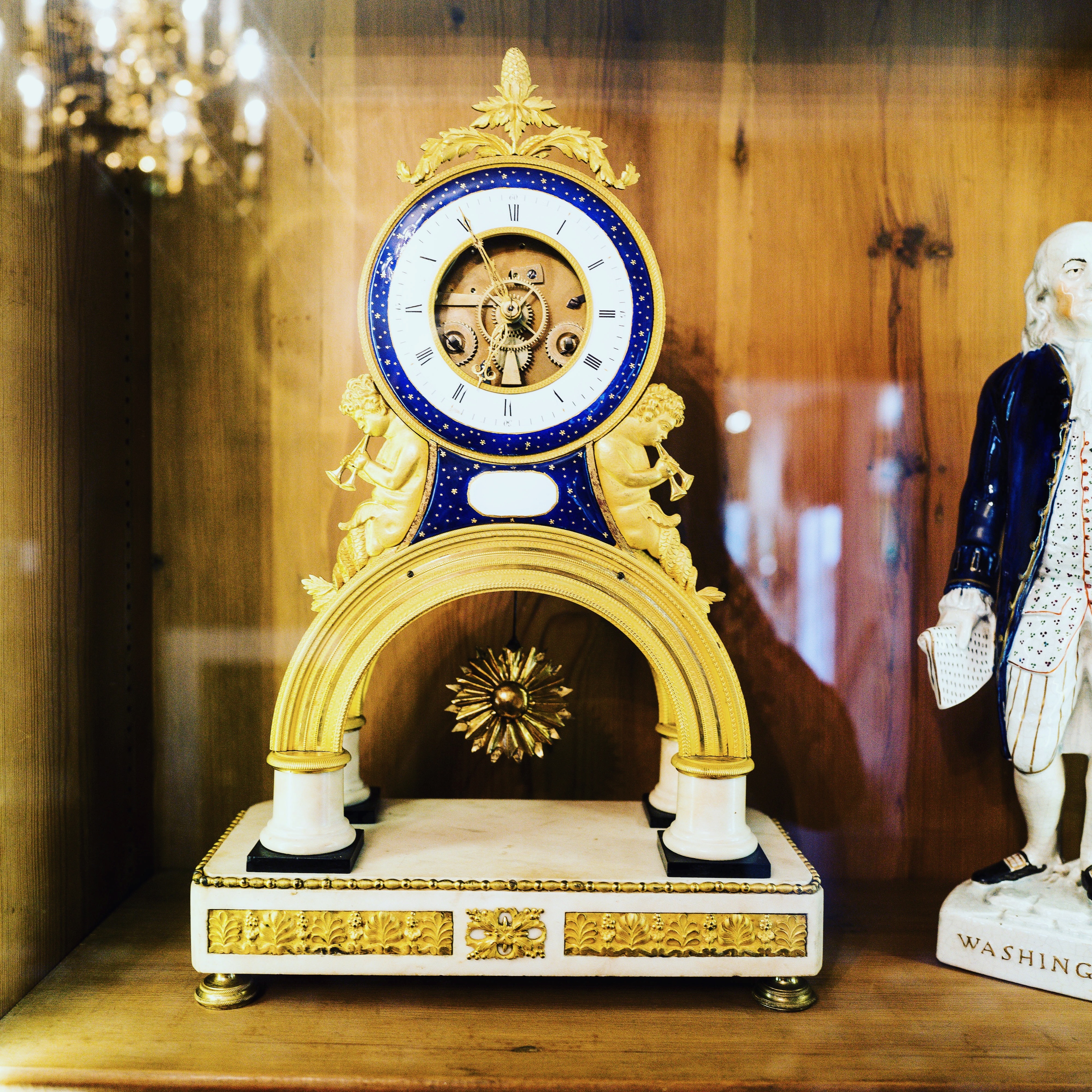 This photograph captures a beautifully ornate clock displayed in a glass cabinet, exuding a sense of history and sophistication. The intricate gold detailing and deep blue accents create a striking focal point, while the warm, soft lighting enhances its luxurious appearance. Adjacent to the clock, a figurine adds an element of storytelling, further enriching the composition with a hint of nostalgia.