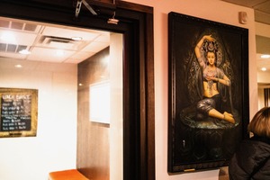 This photograph captures a serene moment in a cafe, where a striking artwork of a seated figure exudes calmness on the wall. The warm lighting enhances the intimate atmosphere, contrasting with the more muted tones of the adjacent space and chalkboard menu. The composition draws the viewer’s eye towards the art, inviting reflection within this cozy setting.