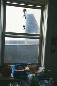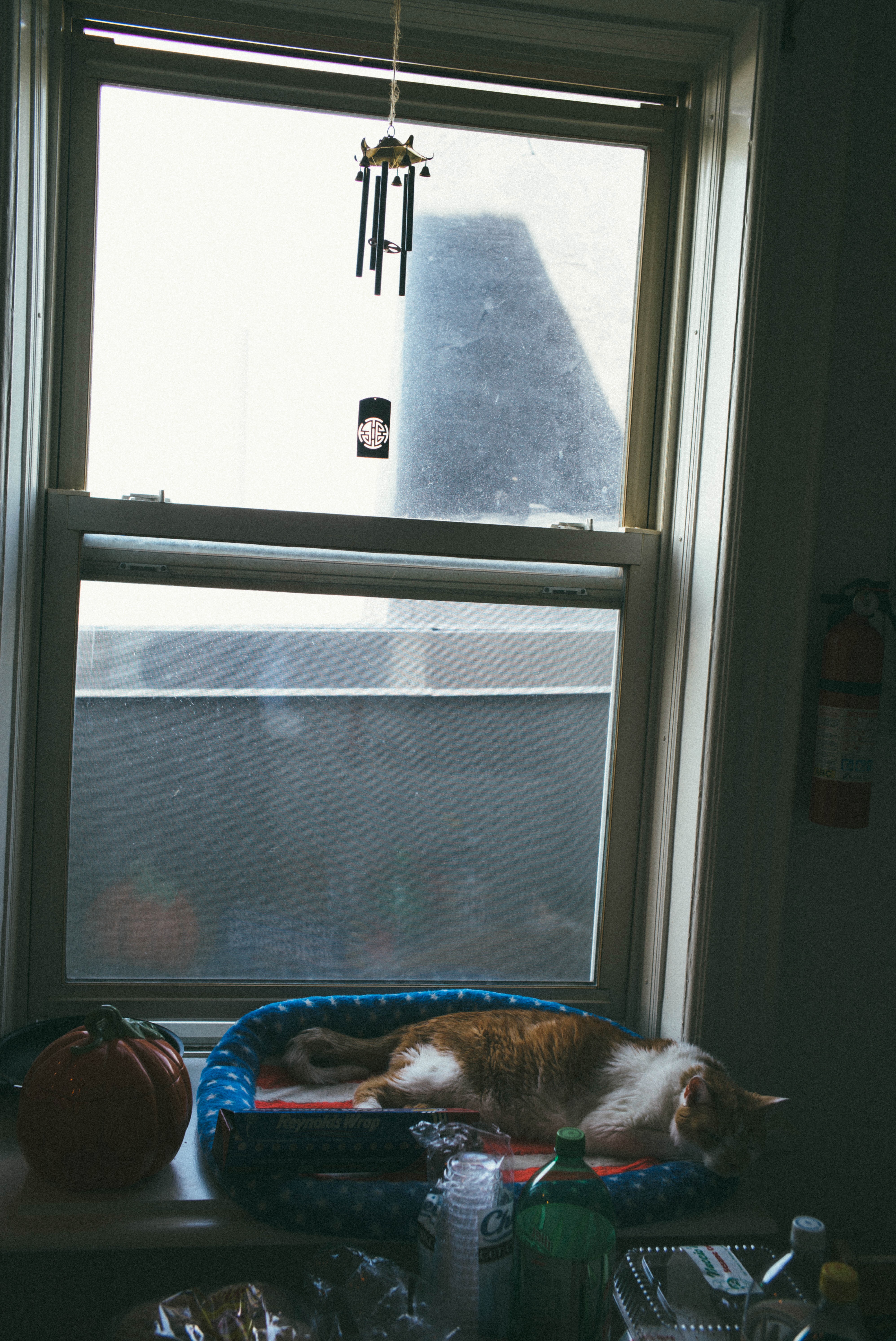 A cozy interior scene captures a relaxed cat sprawled in a window nook, beneath a gently swinging wind chime. The soft, diffuse light filters through the glass, illuminating the domestic clutter and creating a warm, tranquil atmosphere. The contrast of the cat's orange fur against the blue bed adds a comforting pop of color to this serene moment.