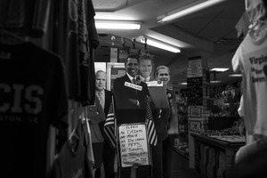 In this monochrome photograph, life-sized cardboard cutouts of notable figures stand prominently in a cluttered gift shop, emanating a sense of nostalgia and tongue-in-cheek humor. The ambient lighting casts soft shadows, enhancing the contrast between the figures and the surrounding merchandise, while the playful signs bolted to the cutouts add an amusing touch. The overall mood feels light-hearted yet slightly surreal, inviting viewers to ponder the intersection of consumerism and celebrity culture.