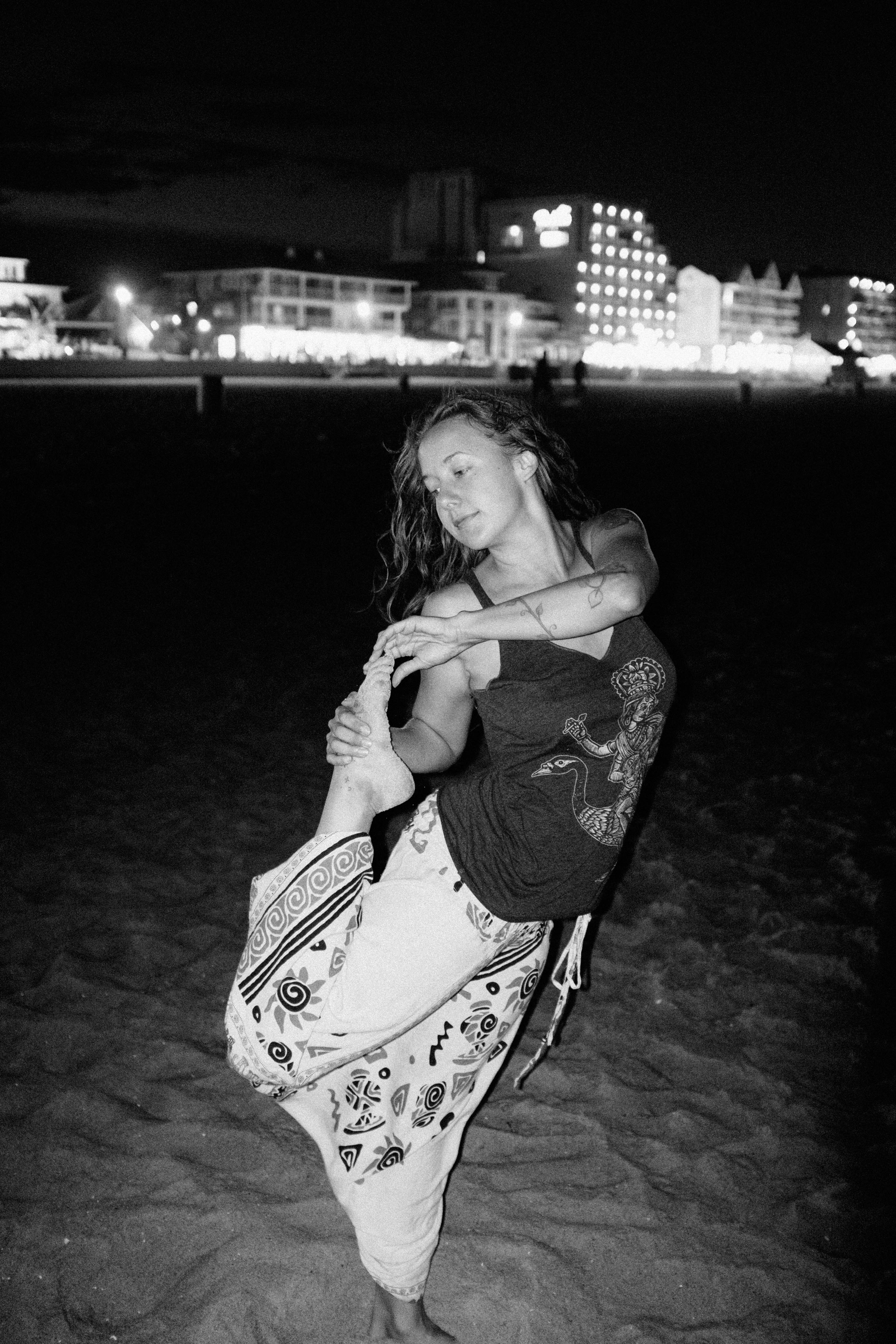 In this evocative black and white photograph, a woman stretches gracefully on a sandy beach at night, embodying both strength and serenity. The soft glow from distant lights creates a contrasting backdrop, enhancing the intimate mood of the scene as she pauses in a moment of self-reflection. Her relaxed posture and flowing attire suggest a connection to nature and freedom, inviting viewers into a tranquil, contemplative atmosphere.