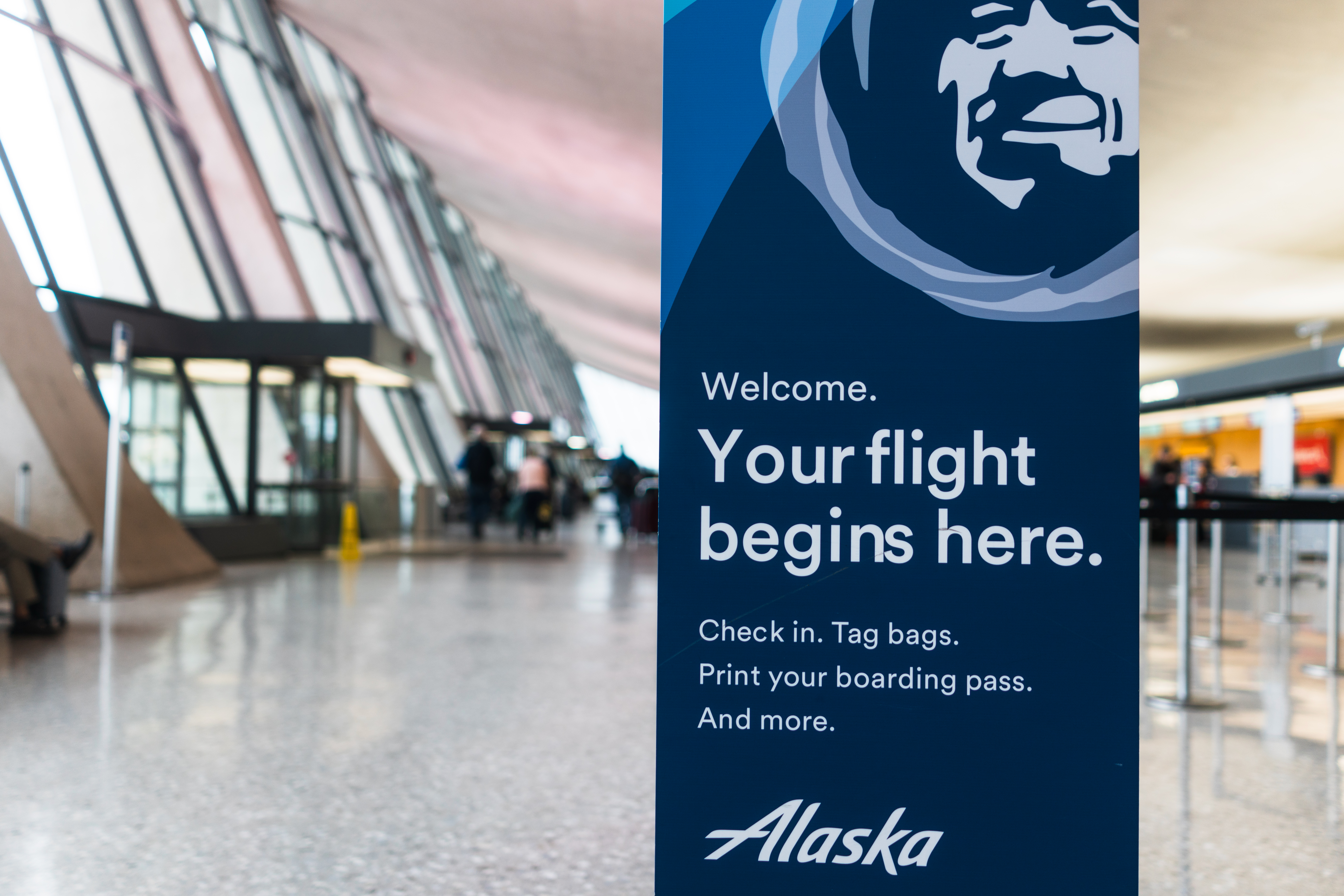 The photograph features a prominent Alaska Airlines welcome sign in a modern airport terminal. The mood is inviting and dynamic, emphasizing the excitement of travel, while natural light streams in through large windows, creating a warm ambiance. The composition draws the eye to the sign, guiding viewers through the bustling space filled with travelers and anticipation.