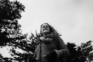 Captured against a dramatic sky, a woman stands with a bright smile, embodying the spirit of adventure. The black-and-white composition highlights her expression and the surrounding trees, creating a serene yet uplifting mood. The soft light accentuates her features while the shadows of the foliage add depth to the scene.