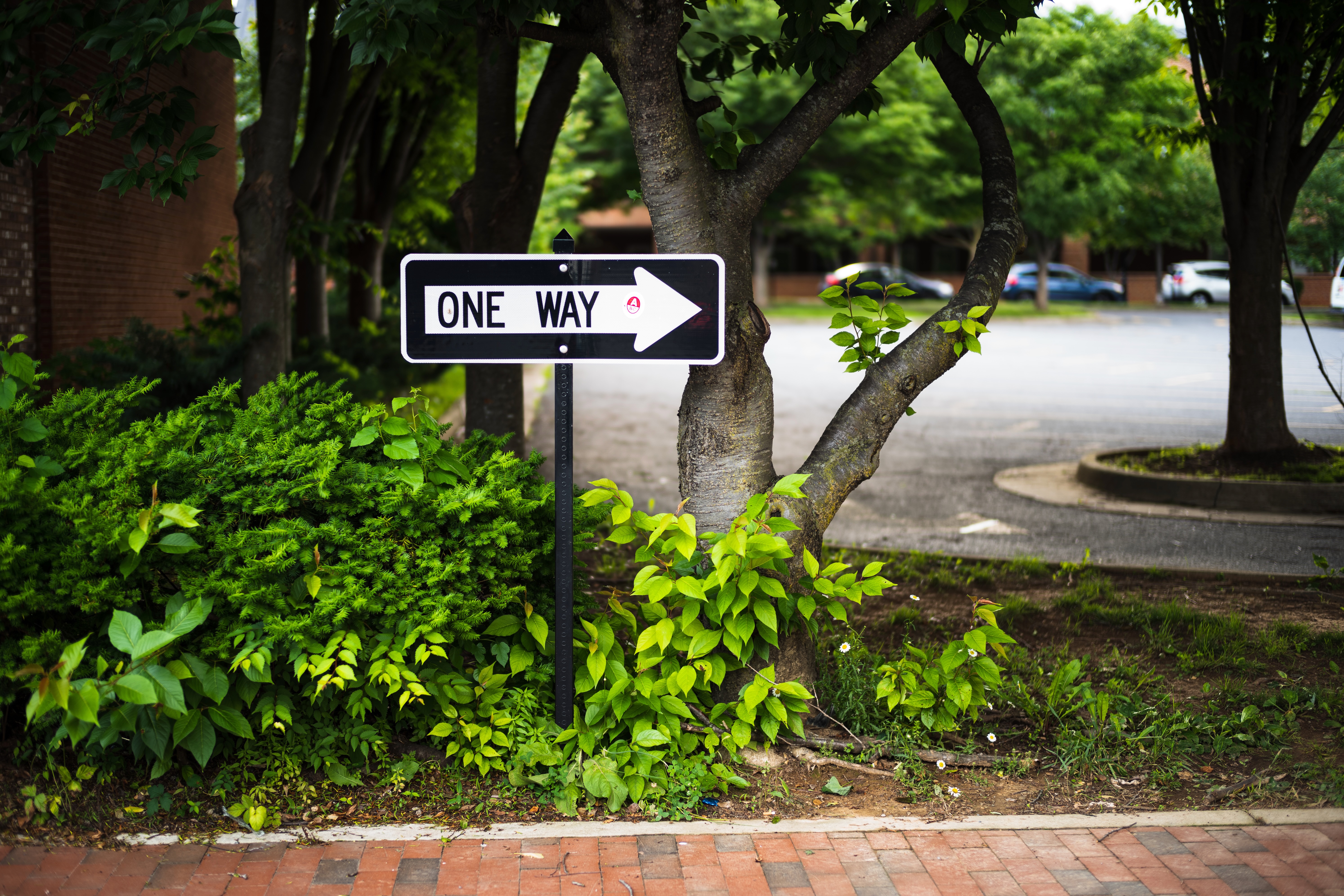 The photograph captures a solitary 'One Way' sign amidst a lush green setting, framed by vibrant foliage and sturdy trees. The soft, diffused lighting accentuates the contrasting shapes of the sign and the thriving plants, creating a serene yet purposeful mood. The composition invites contemplation of direction and pathways, blending urban elements with the tranquility of nature.