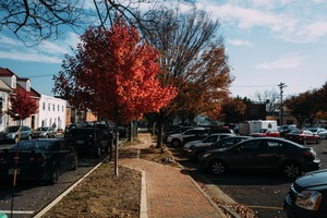 This photograph captures a vibrant autumn scene, where a striking red tree stands prominently alongside a lined pathway, inviting seasonal reflection. Soft, diffused sunlight filters through the branches, casting gentle shadows on the ground, while cars parked nearby form a subtle urban backdrop. The overall mood is calm and inviting, celebrating the beauty of fall amidst everyday life.
